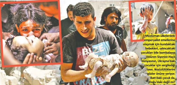 En ufak meseleleri dahi krize dönüştüren, “Özgürlük ve demokrasi getireceğiz’ naralarıyla İslam ülkelerine anında müdahale ederek çoluk çocuk demeden insanları vahşice katleden Haçlı dünyası, Rusya-Ukrayna savaşı üzerinden büyük bir ikiyüzlülüğe imza attı. Irak, Afganistan, Suriye ve Filistin gibi Müslüman ülkelerde katledilen minik yavruları görmezden gelen faşist Batı, saç ve göz rengi gibi sembolik kavramlar üzerinden Ukrayna’daki çocukların ölmeyi hak etmediğini söyledi.