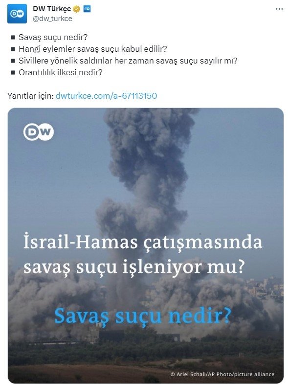 DW Türkçe’nin “Hangi eylemler savaş suçu kabul edilir?” başlıklı haberinin ardından RTÜK Başkanı Şahin sosyal medya hesabından paylaşım yaparak kanuni sürecin başlatıldığını açıkladı.