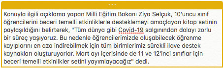 Milli Eğitim Bakanlığından yapılan yazılı açıklamaya göre, lise öğrencilerine yönelik beceri temelli etkinlikler setinin ikincisi 10'uncu sınıflara yönelik hazırlandı. Kaynaklar bugün her öğrencinin ve öğretmenin 'eba.gov.tr'deki sayfasında erişime açıldı. Beceri temelli etkinlikler kaynağında Türk Dili ve Edebiyatı, Tarih, Coğrafya, Felsefe, Matematik, Fizik, Kimya, Biyoloji, İngilizce derslerinden 980 etkinlik bulunuyor. Etkinliklere eklenen kare kodlar aracılığıyla öğrencilerin ilgili ders kitabında kazanımların işlendiği sayfalara ulaşmaları da sağlanıyor.