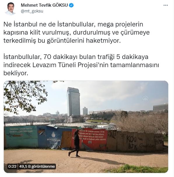 İmamoğlu’nun uygulamalarının ardından Esenler Belediye Başkanı Mehmet Tevfik Göksu sosyal medya hesabı üzerinden bütün İstanbullular adına çağrı yaptı. Göksu çağrısında, “Ne İstanbul ne de İstanbullular, mega projelerin kapısına kilit vurulmuş, durdurulmuş ve çürümeye terkedilmiş bu görüntülerini haketmiyor. İstanbullular, 70 dakikayı bulan trafiği 5 dakikaya indirecek Levazım Tüneli Projesi'nin tamamlanmasını bekliyor” ifadelerini kullandı.