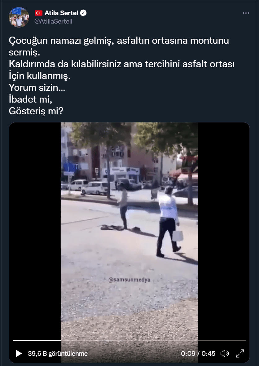 İddiaya göre Samsun’da bir vatandaş, yolun ortasında namaza durdu. Sosyal medyada viral olmak için çekildiği düşünülen görüntüler, CHP’liler tarafından siyasi malzeme haline getirildi. Her kesimin az da olsa tepki gösterdiği görüntüleri CHP’liler, “Siyasal İslam’ın şovu” şeklinde gereksiz, lüzumsuz bir tarafa çekmeye çalıştı.