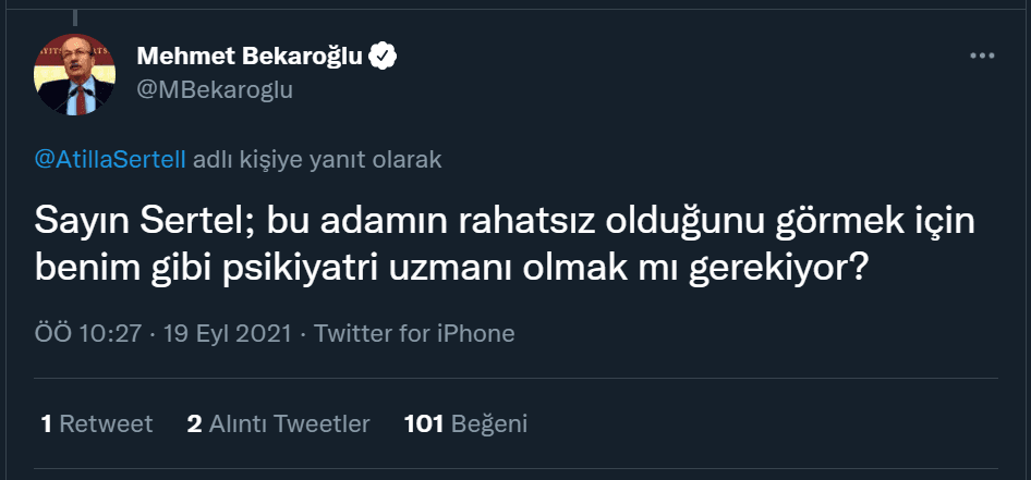 Görüntülerin büyütülmemesi gerektiğini düşünen Bekaroğlu, “Sayın Sertel; bu adamın rahatsız olduğunu görmek için benim gibi psikiyatri uzmanı olmak mı gerekiyor?” diyerek tepkisini dile getirdi.