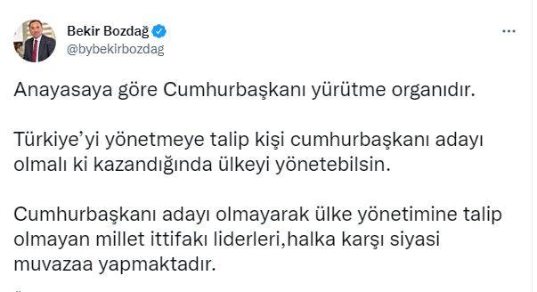 Bozdağ paylaşımında, “Anayasaya göre Cumhurbaşkanı yürütme organıdır. Türkiye’yi yönetmeye talip kişi cumhurbaşkanı adayı olmalı ki kazandığında ülkeyi yönetebilsin. Cumhurbaşkanı adayı olmayarak ülke yönetimine talip olmayan millet ittifakı liderleri, halka karşı siyasi muvazaa yapmaktadır. Cumhurbaşkanı adayı olmayan millet ittifakı liderleri, hangi gerekçe ile halktan oy isteyecek? ‘Hele bir adayımızı seçtirelim, sonra onun yerine ülkeyi biz yönetiriz’ demek, halka karşı siyasi muvazaadır. Halk, kendine karşı siyasi muvazaa yapan ikiyüzlüleri sevmez ve seçmez. Millet ittifakı liderleri; Cumhurbaşkanımız Sayın Erdoğan karşısında kazanamayacakları, kendilerini ülkeyi yönetmeye/cumhurbaşkanlığına layık görmedikleri, sorumluluk almaktan korktukları için mi cumhurbaşkanı adayı olmuyorlar ya da içlerinden birini aday yapmıyorlar?” ifadelerini kullanarak muhalefete yüklendi.