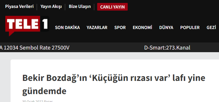 Sosyal medyada Bozdağ'ı hedef alanlara ayak uyduran Merdan Yanardağ yönetimindeki TELE 1, genç evlilik mağdurları için söylenen sözleri, sanki tecavüzcüler için söylenmiş gibi çarpıtarak yine ahlaksızca iftira attı. TELE 1 televizyonunda son olarak Sedef Kabaş, Cumhurbaşkanı Recep Tayyip Erdoğan'a hakaret etmiş, Yanardağ da, hakareti ve iftirayı gazetecilikten sayarak, RTÜK'ün TELE 1'i hedef aldığını öne sürmüştü.