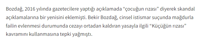 Bekir Bozdağ, Adalet Bakanlığı yaptığı son dönemde, genç evlilik mağdurlarının tecavüzcü olmadığını belirterek, ortada gönül rızası ile dini ve resmi nikahların kıyılarak bir evlilik olduğunu söylemişti. Genç evlilik yapmaları sebebi ile yuvaları dağıtılıp haksız yere hapse atılan erkeklerin mağduriyetini ve eşlerinin içinde bulunduğu çıkmazı anlatan Bozdağ'ın sözleri, sanki tecavüzcüler için söylenmiş gibi kırpılıp, çarpıtılarak, ahlaksızca hedefe kondu.
