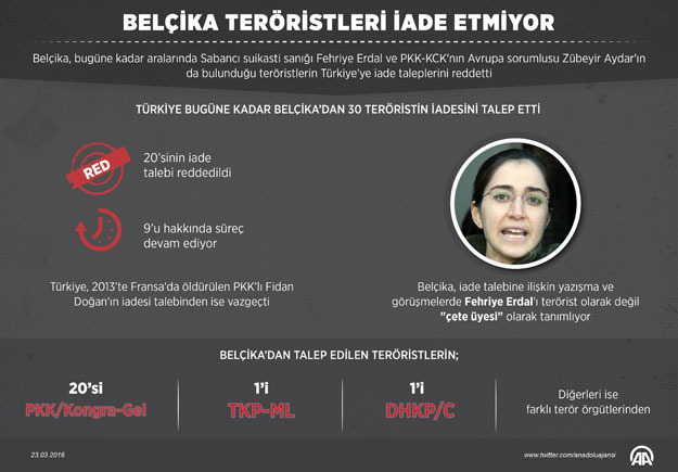 Belçika hükümeti, bugüne kadar Türkiye'nin, aralarında Sabancı suikasti sanığı DHKP/C üyesi Fehriye Erdal ve PKK-KCK'nın Avrupa sorumlusu Zübeyir Aydar'ın da yer aldığı teröristlerin iadesine ilişkin taleplerini reddetti.