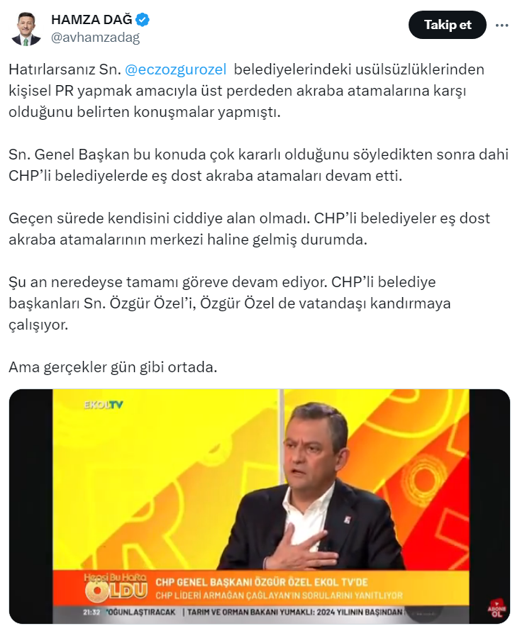 AK Parti Genel Başkan Yardımcısı Hamza Dağ sosyal medya hesabından Özgür Özel’in vatandaşı nasıl kandırdığını böyle ifade etti. Hamza Dağ, sosyal medya hesabından Özgür Özel’i paylaşarak, “Sn. Genel Başkan bu konuda çok kararlı olduğunu söyledikten sonra dahi CHP’li belediyelerde eş dost akraba atamaları devam etti.