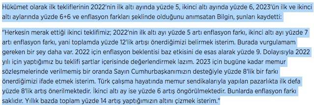 2022 ve 2023 yıllarındaki maaşlara ilişkin zammın belirleneceği 6. Dönem Toplu Sözleşme görüşmeleri bugün sona erdi. Çalışma ve Sosyal Güvenlik Bakanı Vedat Bilgin sürece ilişkin sonucunu bugün açıkladı. 2022 ilk 6 ayında % 5 ve enflasyon farkı, ikinci 6 ayında % 7 en yüzde 12'lik artış söz konusu oldu. 2023'ün ilk 6 ayında % 8, ikinci 6 ayında ise % 6 olmak üzere yüzde 14'lük artış kararı alındı. Çalışma ve Sosyal Güvenlik Bakanı Vedat Bilgin, sözleşmeli personel için 3+1 ilkesini benimsediklerini söylemişti. Hali hazırda kamuda 3+1 modeliyle çalışan sözleşmeli memurlar bulunuyor. Yapılacak düzenlemeyle, 4 yılını dolduran sözleşmeliler kadroya geçebilecek.