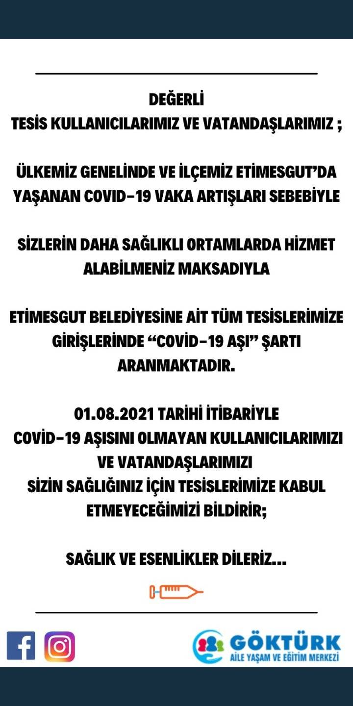 Duyuruda, "Değerli tesis kullanıcılarımız ve vatandaşlarımız, ülkemiz genelinde ve ilçemiz Etimesgut'ta yaşanan Covid-19 artışları sebebiyle sizlerin daha sağlıklı ortamlarda hizmet alabilmeniz maksadıyla Etimesgut Belediyesi'ne ait tüm tesislerimize giriş ve çıkışlarda 'Covid-19 aşı' şartı aranmaktadır. 01.08.2021 tarihi itibariyle Covid-19 aşısını olmayan kullanıcılarımızı ve vatandaşlarımızı sizin sağlığınız için tesislerimize kabul etmeyeceğimizi bildirir, sağlık ve esenlikler dileriz." ifadeleri kullanıldı.