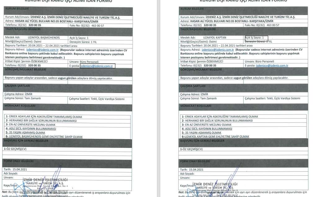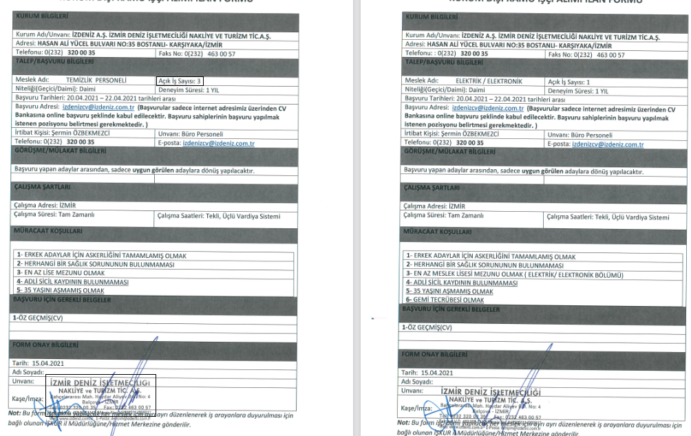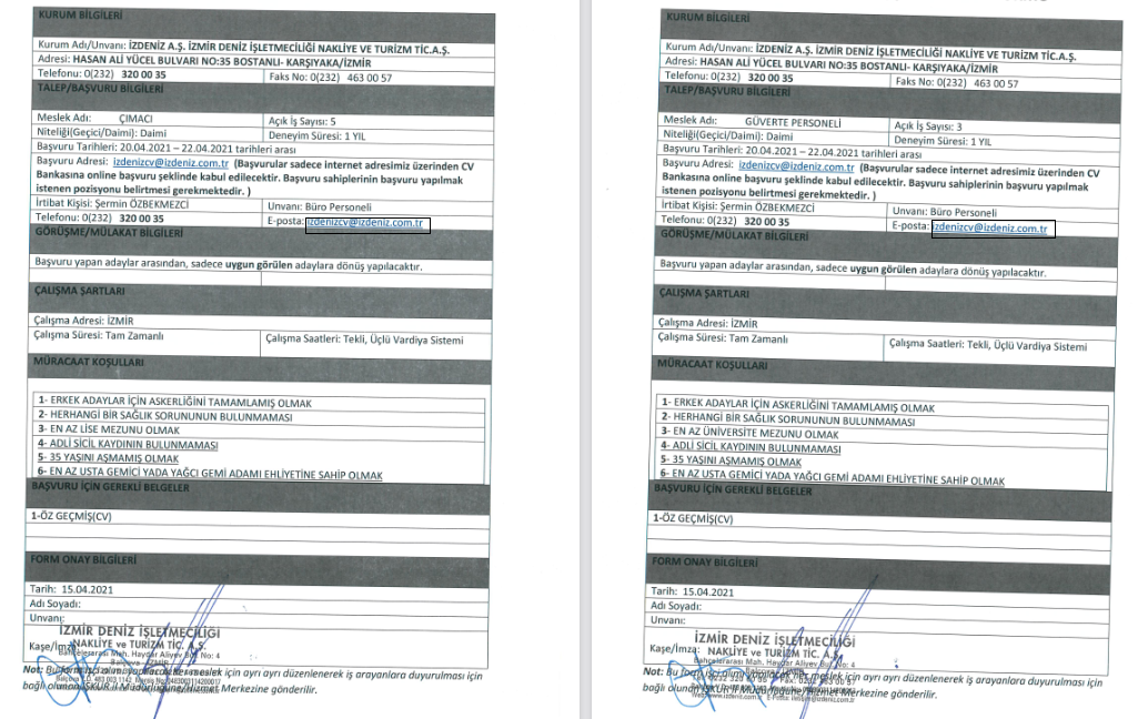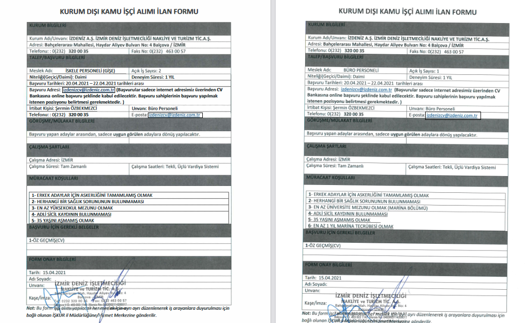 İzmir Büyükşehir Belediyesi İzdeniz A.Ş personel alımına başvuru yapmak isteyen adaylar, 22 Nisan 2021 tarihine kadar [email protected] cv göndererek başvuru yapmalıdırlar. Başvuru sahiplerinin başvuru yapılmak istenen pozisyonu belirtmesi gerekmektedir.