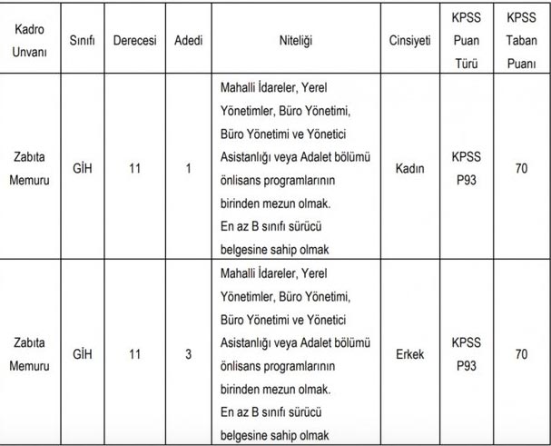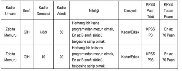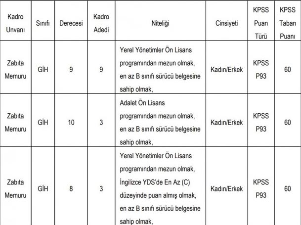 Zabıta alım ilan son dakika: Resmi Gazete'nin bugünkü sayısında Zabıta memuru olmak için yeni zabıta memur alım ilanı yayımlandı. Zabıta olmak isteyen adaylar için yayımlanan zabıta memur alım ilanında, "Belediye başkanlığı bünyesinde, 657 sayılı Devlet Memurları Kanununa tabi olarak istihdam edilmek üzere; Belediye Zabıta Yönetmeliği hükümlerine göre aşağıda unvanı, sınıfı, derecesi, adedi, nitelikleri, KPSS puan türü, KPSS taban puanı ve diğer şartları taşımak kaydıyla belirtilen boş kadrolara açıktan atama yoluyla zabıta memuru alınacaktır." denildi.