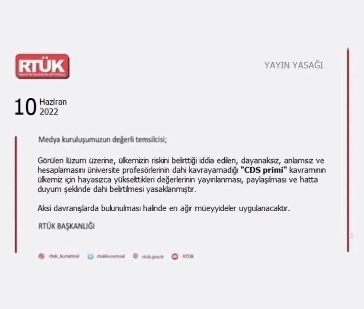 Uyduruk belgede sanki medya kuruluşu temsilcilerine gönderilmiş gibi yazılarak; "CDS primi kavramının duyum şeklinde dahi belirtilmesi yasaklanmıştır" denerek bir yalana imza atıldı.