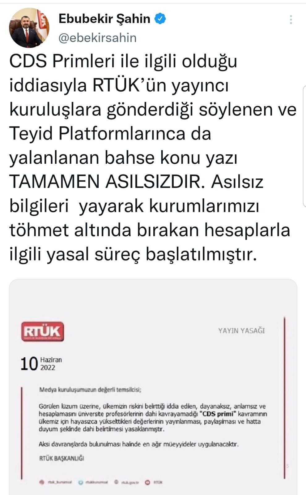 "CDS Primleri ile ilgili olduğu iddiasıyla RTÜK’ün yayıncı kuruluşlara gönderdiği söylenen ve Teyid Platformlarınca da yalanlanan bahse konu yazı TAMAMEN ASILSIZDIR. Asılsız bilgileri yayarak kurumlarımızı töhmet altında bırakan hesaplarla ilgili yasal süreç başlatılmıştır."