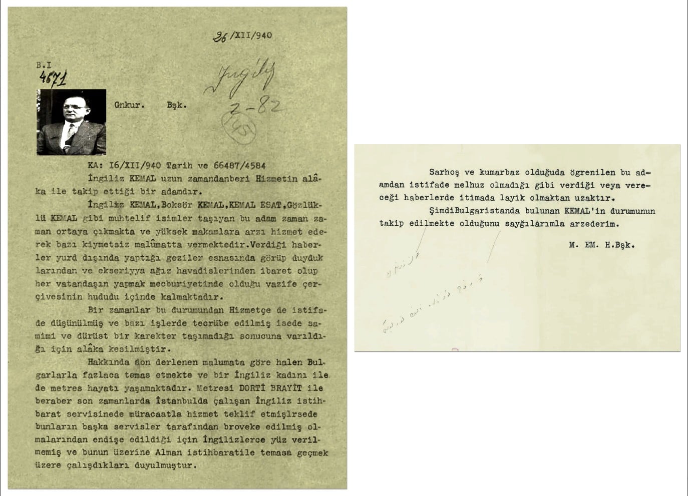 Hakkında dün derlenen malumata göre, halen Bulgarlarla fazlaca temas etmekte ve bir İngiliz kadını ile de metres hayatı yaşamaktadır. Metresi Dorti Brayit ile beraber son zamanlarda İstanbul'da çalışan İngiliz İstihbarat Servisi'ne de müracaatla hizmet teklif etmişlerse de bunların başka servisler tarafından provoke edilmiş olmalarından endişe edildiği için İngilizlerce yüz verilmemiş ve bunun üzerine Alman istihbaratı ile temasa geçmek üzere çalıştıkları duyulmuştur. Sarhoş ve kumarbaz olduğu da öğrenilen bu adamdan istifade melhuz olmadığı gibi verdiği veya vereceği haberler de itimada layık olmaktan uzaktır. Şimdi Bulgaristan'da bulunan Kemal'in durumunun takip edilmekte olduğunu saygılarımla arz ederim."