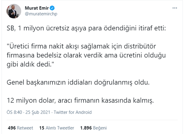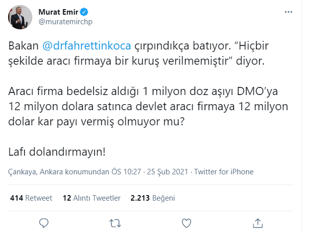 CHP Ankara Murat Emir ise, belge göstererek tüm gerçekleri Türkiye'ye kamoyunda anlatan Sağlık Bakanı Fahrettin Koca'nın açıklamasından utanmayarak, yalanı sürdürdü. Twitter hesabından paylaşımda bulunan CHP'li Emir, "Bakan Fahrettin Koca çırpındıkça batıyor. 'Hiçbir şekilde aracı firmaya bir kuruş verilmemiştir' diyor. Aracı firma bedelsiz aldığı 1 milyon doz aşıyı DMO’ya 12 milyon dolara satınca devlet aracı firmaya 12 milyon dolar kar payı vermiş olmuyor mu? Lafı dolandırmayın." dedi.