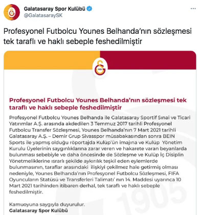 Galatasaray'da sözleşmesi sezon sonunda bitecek olan Younes Belhanda ile yollar ayrıldı. Galatasaray Kulübü, Faslı futbolcu Younes Belhanda'nın sözleşmesinin tek taraflı ve haklı sebeple feshedildiğini KAP'a bildirdi.