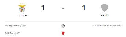 Öte yandan ev sahibi takımda Adil Taarabt, mücadelenin 7. dakikasında direkt kırmızı kart görerek oyun dışı kaldı. Benfica bu sonuçla puanını 58'e yükseltti. Vizela ise puanını 25'e çıkardı.