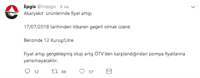 EPSİS'in Twitter'dan yaptığı açıklamada, "Akaryakıt ürünlerinde fiyat artışı; 17/07/2018 tarihinden itibaren geçerli olmak üzere; Benzinde 12 Kuruş/Litre Fiyat artışı gerçekleşmiş olup artış ÖTV'den karşılandığından pompa fiyatlarına yansımayacaktır." ifadeleri kullanıldı.