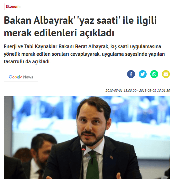 Türkiye yaz saati uygulamasına Berat Albayrak Berat Albayrak Enerji Bakanı, Fatih Dönmez de Enerji ve Tabii Kaynaklar Bakanlığı Müsteşarı iken geçmişti.