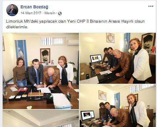 CHP'li isimlerle sözleşme imzalandığı ana ilişkin fotoğrafların bulunduğu paylaşımda "Limonluk mahallesindeki yapılacak olan yeni CHP il binasının arsası hayırlı olsun dileklerimle" ifadesinin yer aldığı görüldü.