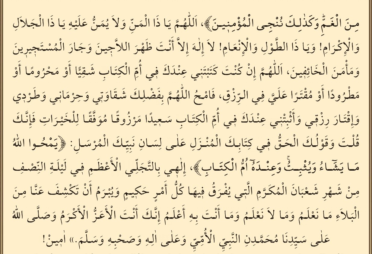 İlâhî! Kıymetli Şa’bân ayının her hikmetli işin kendisinde ayrılıp kesin karara bağlandığı on beşinci gecesindeki en büyük tecellî hürmetine Senden dileğimiz, bildiğimiz ve bilmediğimiz, en iyi senin bildiğin tüm belâları bizden açıp gidermendir. Şüphesiz ki en ulu ve en iyi olan ancak Sensin.