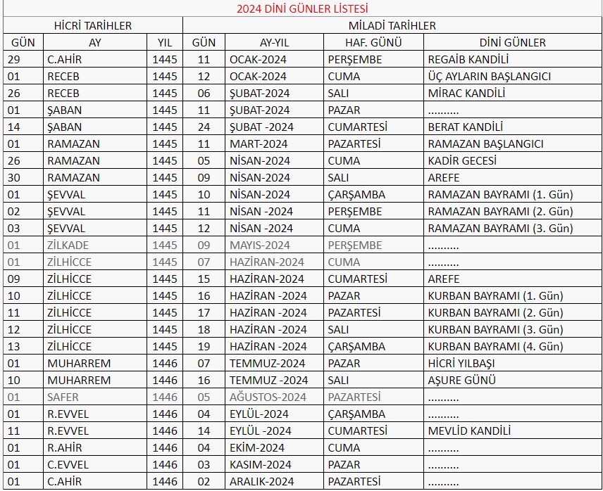 İşte, 2024 dini günler takvimi