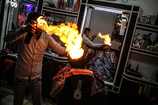 Gazzeli berber Advan, elektrik sıkıntısına karşı yakarak saç tıraşı yöntemini kullanıyor.