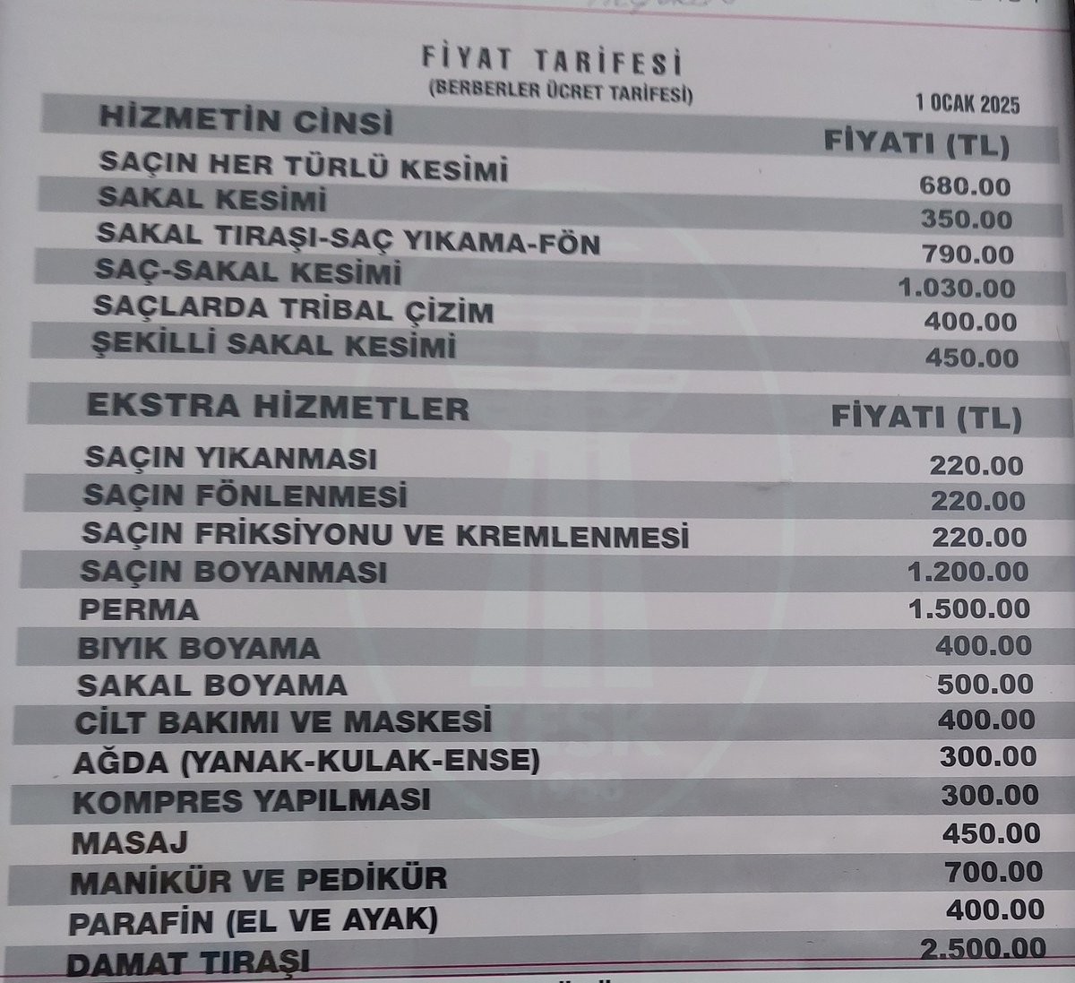 Yeni tarifeye göre, yalnızca “Saç Kesimi” 680 TL, “Sakal Tıraşı + Saç Yıkama + Fön” ise tam 790 TL olarak belirlendi. “Saç ve Sakal Kesimi” hizmetinin bedeli 1.030 TL’ye çıkarken, “Damat Tıraşı” için ödenmesi gereken miktar 2.500 TL’ye kadar yükseldi.