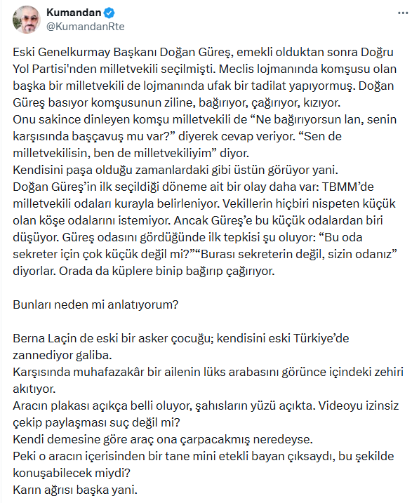 Olayı köpürttükçe köpürttüğü göze çarpan Laçin, yaptığı paylaşımında sürücünün özür dilemediğini ve durumu hafife aldığını öne sürdü.