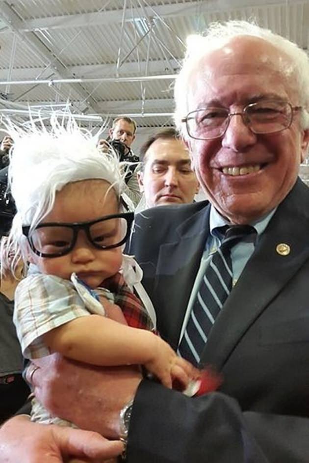 Sosyalist aday Sanders’a benzemesi için başına beyaz peruk ve gözüne kocaman siyah çerçeveli gözlük takılan üç aylık bebeğin fotoğrafı tüm Haber ajansları tarafından servis edildi ve kampanyanın en renkli karesi olarak sosyal medyanın çok konuşulanları arasına girdi.