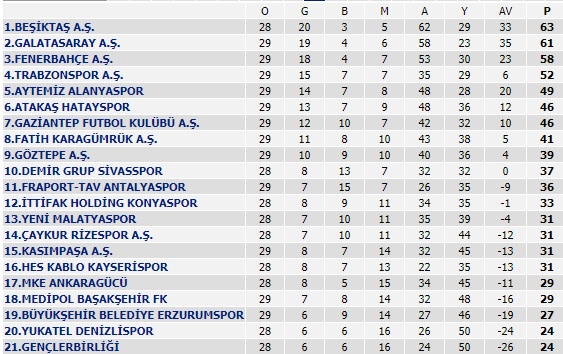 Beşiktaş ile Fenerbahçe 21 Mart Pazar günü saat 19.00'da karşı karşıya gelecek. Beşiktaş 63 puanla zirvede yer r alırken Fenerbahçe 58 puanla üçüncülük koltuğunda oturuyor. Süper Lig'in ilk yarısında Kadıköy'de oynanan maçı Beşiktaş 4-3'lük skorla kazanmıştı. Öte yandan ligin 31.haftasını Atakaş Hatayspor bay geçecek.