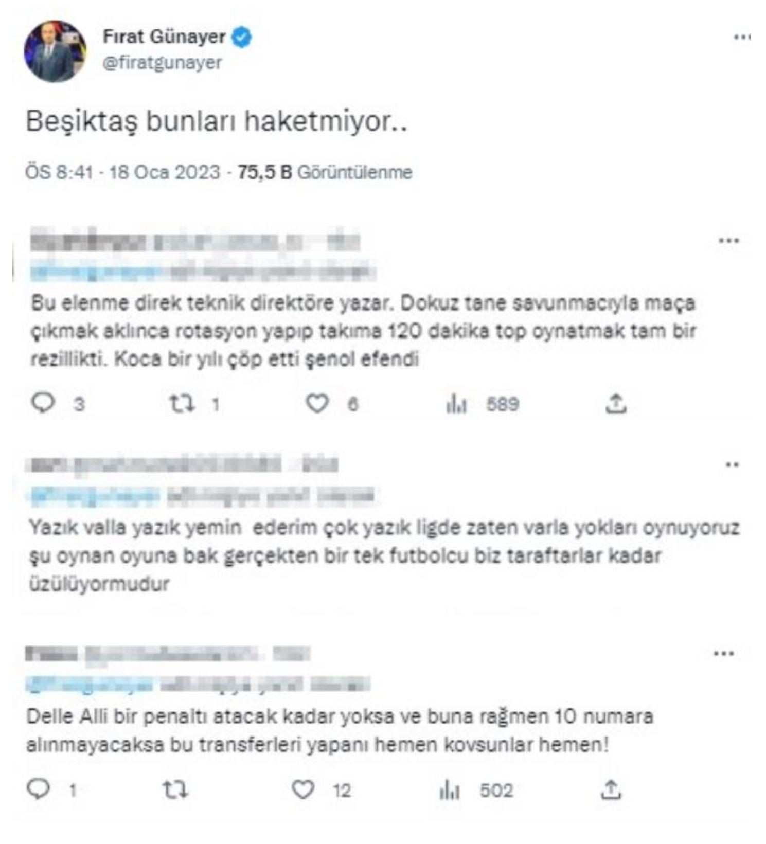 Ziraat Türkiye Kupası Son 16 Turu'nda Ankaragücü'ne elenen Beşiktaş'ta taraftarlar ortaya koyulan futbol ve oyuncu değişikliklerine isyan etti. Siyah-Beyazlı taraftarlar sosyal medyada sert eleştiriler yaptı.