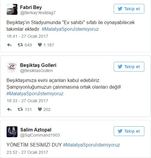 Yeni Malatyaspor'un Beşiktaş'ın stadı Vodafone Arena'da sezon sonuna kadar iç saha maçlarını oynamak istemesi üzerine, siyah-beyazlı taraftarlar tepkilerini gösterdi. "MalatyaSporuİstemiyoruz" hashtag'i Twitter'da Türkiye Gündemi'nde 1. sıraya yükseldi.