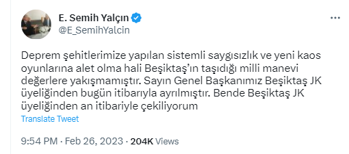 Deprem şehitlerimize yapılan sistemli saygısızlık ve yeni kaos oyunlarına alet olma hali Beşiktaş’ın taşıdığı milli manevi değerlere yakışmamıştır. Sayın Genel Başkanımız Beşiktaş JK üyeliğinden bugün itibarıyla ayrılmıştır. Ben de Beşiktaş JK üyeliğinden an itibariyle çekiliyorum.