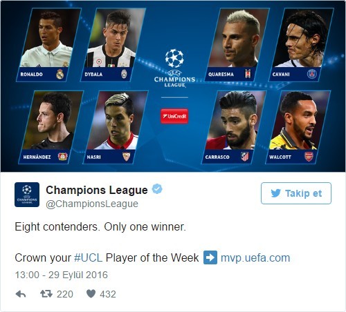 UEFA Şampiyonlar Ligi'nde sona eren ikinci hafta maçlarının ardından Beşiktaş'ın Portekizli yıldızı Quaresma, haftanın en iyi futbolcusu ile en iyi golünün sahibi kategorilerinde aday gösterildi.