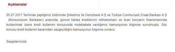 "05.07.2017 Tarihinde yaptığımız bildirimde Şirketimiz ile Denizbank A.Ş ve Türkiye Cumhuriyeti Ziraat Bankası A.Ş (Konsorsiyum Bankaları) arasında, güncel banka kredilerinin refinansmanı ve ticari borçların finansmanında kullanılmak üzere kredi kullanımı konusunda mutabakata vardığımız kamuoyunun bilgisine sunulmuştu. Söz konusu kredi kullanım kararından vazgeçildiğini kamuoyunun bilgisine sunarız. Saygılarımızla."