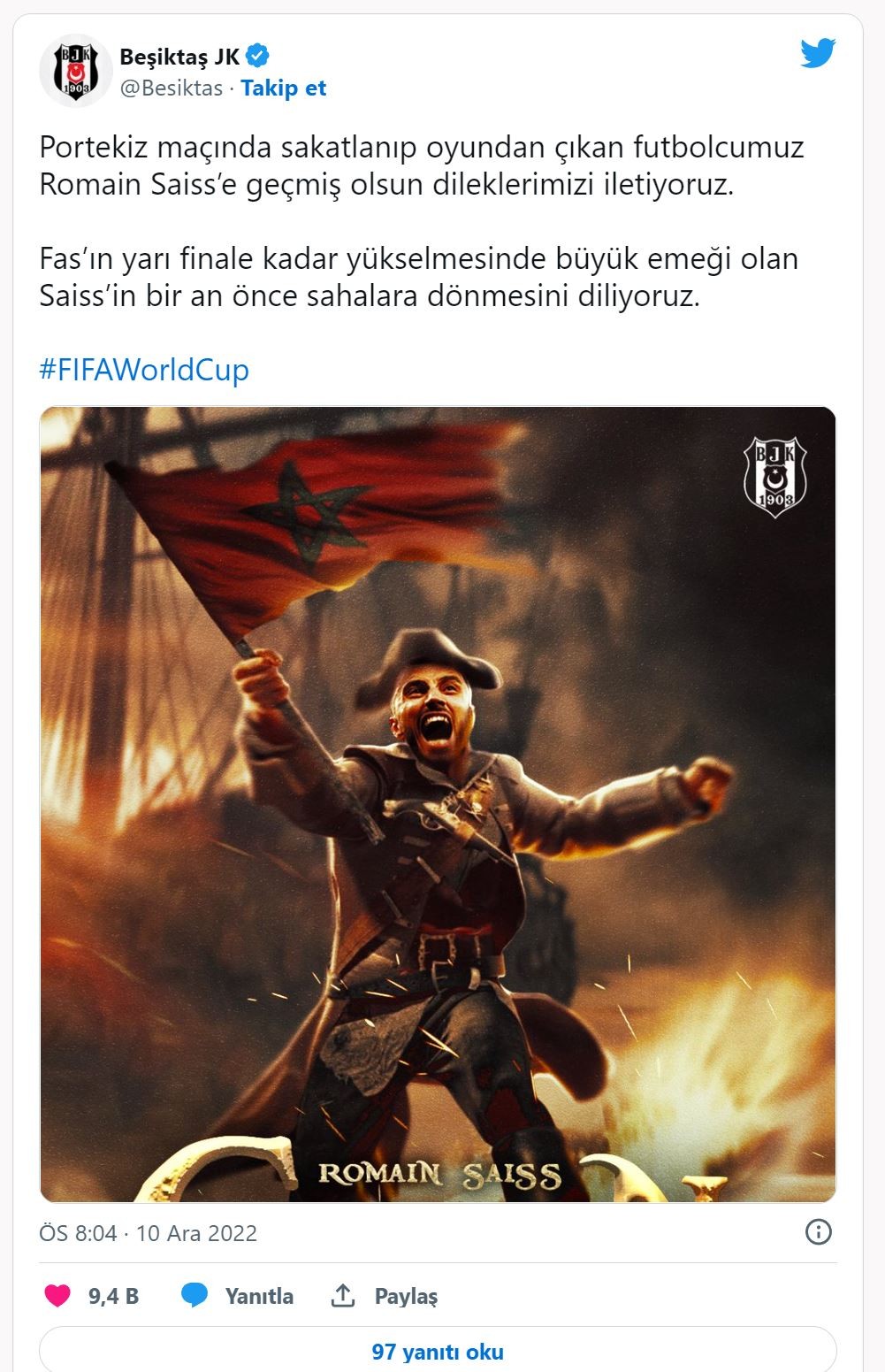 "Portekiz maçında sakatlanıp oyundan çıkan futbolcumuz Romain Saiss’e geçmiş olsun dileklerimizi iletiyoruz. Fas’ın yarı finale kadar yükselmesinde büyük emeği olan Saiss’in bir an önce sahalara dönmesini diliyoruz."