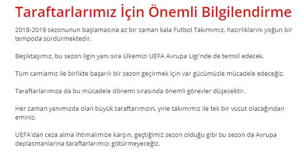 Beşiktaş'tan yapılan açıklamada, "UEFA'dan ceza alma ihtimalimize karşın, geçtiğimiz sezon olduğu gibi bu sezon da Avrupa deplasmanlarına taraftarlarımızı götürmeyeceğiz." ifadelerine yer verildi.