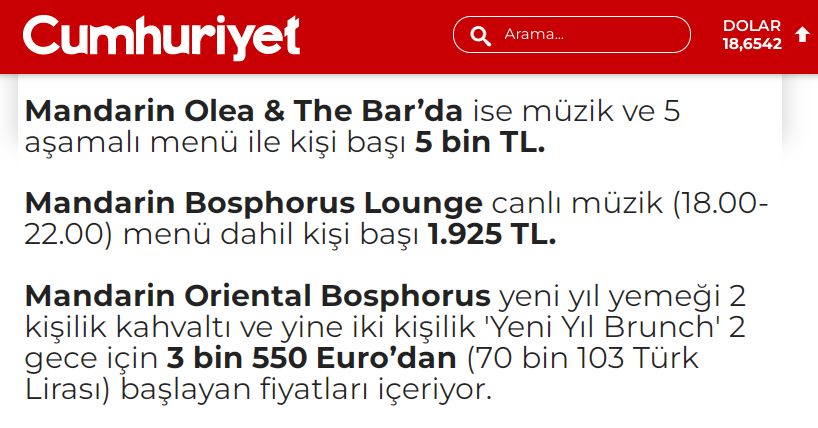 Çırağan Swissotel, Mandarin Oriental, Hilton, Six Senses gibi otellerin yılbaşı kutlaması reklamını yapan Cumhuriyet gazetesi, haberde "ekonomik kriz" çığırtkanlığı da yaparak reklamına kılıf buldu.