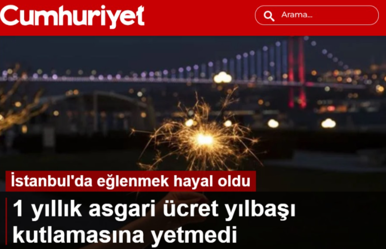 Cumhuriyet gazetesi, ekonomik kriz çığırtkanlığı yapılan bir haber kaleme aldı. Cumhuriyet editörleri, "Millet aç" diyerek başladıkları haberde sözü 5 yıldızlı yılbaşı kutlamalarına getirip, "1 yıllık asgari ücret yılbaşı kutlamasına yetmedi" sonucuna ulaştı.