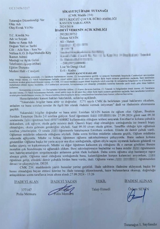 Anne Özlem Sevin, gelen telefon üzerine okula gittiğini belirterek, “Öğretmen bana dedi ki 'Emirhan ağlıyor, okula gelmenizi istiyorum, Emirhan'ın koluna çubukla değdim'. Okulun merdivenlerini çıkarken öğretmeni gördüm, aşağıya iniyordu. Elinde demir çubuk vardı. Emirhan'ı sordum, 'idari kısımda' dedi. İdari odada öğretmenler Emirhan'ı sakinleştirmeye çalışıyorlardı. Oğluma yaklaştım, kolunu gösterdi. 'Başka yerin acıyor mu' dedim', 'Anne kafam acıyor' dedi. Kafasındaki saçlar kapatmış alnındaki yararı. Saçını kaldırdığımda şişlik ve ödem vardı" dedi.
