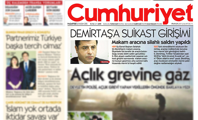 Can Dündar yönetimindeki Cumhuriyet Gazetesi bugün Selahattin Demirtaş'a "Suikast Girişimi" başlıklı haberi manşete taşıdı. Haberde Demirtaş'ın aracında mermi izleri olduğu ve silahlı saldırıya uğradığı öne sürüldü.