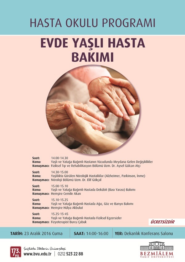 Bezmialem Vakıf Üniversitesi’nde düzenlenen “Hasta Okulu Programı” devam ediyor. 23 Aralık 2016 Cuma günü düzenlenecek olan “Hasta Okulu Programı”nın bu ayki eğitim konusunu “Evde Yaşlı Hasta Bakımı” oluşturuyor.