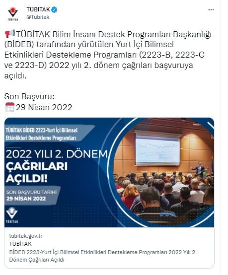 TÜBİTAK Bilim İnsanı Destek Programları Başkanlığı (BİDEB) tarafından yürütülen 2223-B Yurt İçi Bilimsel Etkinlik Düzenleme Desteği Programı, 2223-C Çok Katılımlı Uluslararası Etkinlik Düzenleme Desteği Programı ve 2223-D İkili İşbirliği Anlaşmaları Çerçevesinde Etkinlik Düzenleme Desteği Programı 2022 yılı 2. dönem çağrıları başvuruya açılmıştır. Başvurular, 29 Nisan 2022 saat 17:30’a kadar BİDEB Başvuru ve İzleme Sistemi üzerinden alınacak.