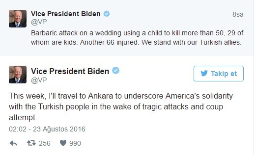 “Bir çocuğun kullanılarak bir düğüne yapılan barbarca saldırı 29’u çocuk 50’den fazla insanı öldürdü. 66 kişi de yaralandı. Müttefikimiz Türkiye ile yan yana duruyoruz. Bu hafta Ankara’yı ziyaret ederek bu trajik saldırının ve darbe girişiminin ardından Amerika’nın Türk halkıyla dayanışmasının altını çizeceğim.”