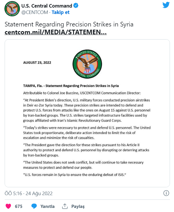 ABD Merkez Kuvvetler Komutanlığı'ndan (CENTCOM) yapılan açıklamada; "ABD ordusu bugün Biden'ın emriyle Suriye'de İran'ın Devrim Muhafızları'na bağlı gruplar tarafından kullanılan altyapı tesislerini hedef aldı" ifadeleri kullanıldı.