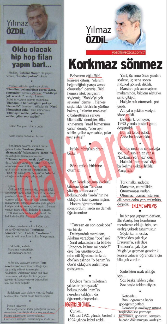 8 yıl önce Hürriyet gazetesinde yayımladığı ve şarkıcı Hadise’nin “İstiklal Marşı’nı okumasını eleştirdiği yazısını tıpkı 1 Şubat 2018’de olduğu gibi birebir kopyalayan Özdil, bugün aynı yazıyı yalnızca isimleri değiştirerek yeniden yayımlayarak, Sözcü okurlarının aklıyla bir kez daha dalga geçti.