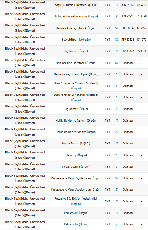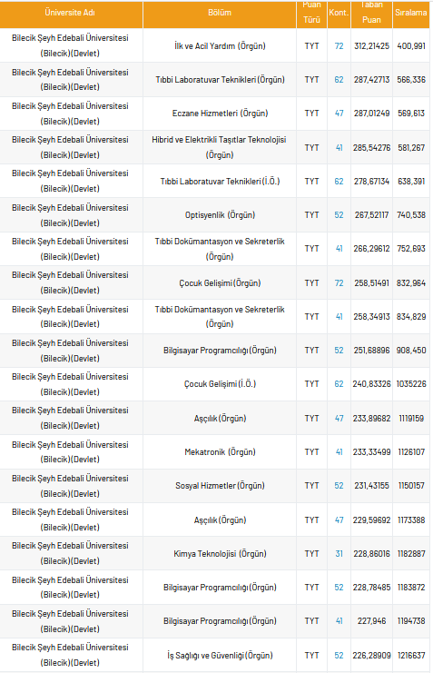 Bilecik Şeyh Edebali Üniversitesi 2 yıllık taban puanları 2021, yüzdelik dilimleri ve kontenjan sayıları kaçtır?
