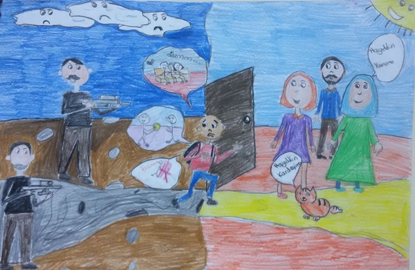 Hayrunnisa TOMBAŞ: Bizim ülkemizdeki çocuklar diğer mülteci çocukları farklı görüyorlar. Onlar sanki korkunç bir çocuk ya da pis bir çocukmuş gibi düşünüyorlar. Ama mülteci çocuklar kendi ülkelerinden ayrılmak zorunda kalmış normal çocuklar. Yeni arkadaş edinmeye ihtiyaçları var. Normalde bizim ülkemizin çocuklarının yapması gereken onlarla beraber oyunlar oynamak resmimde bunu anlatmaya çalıştım.
