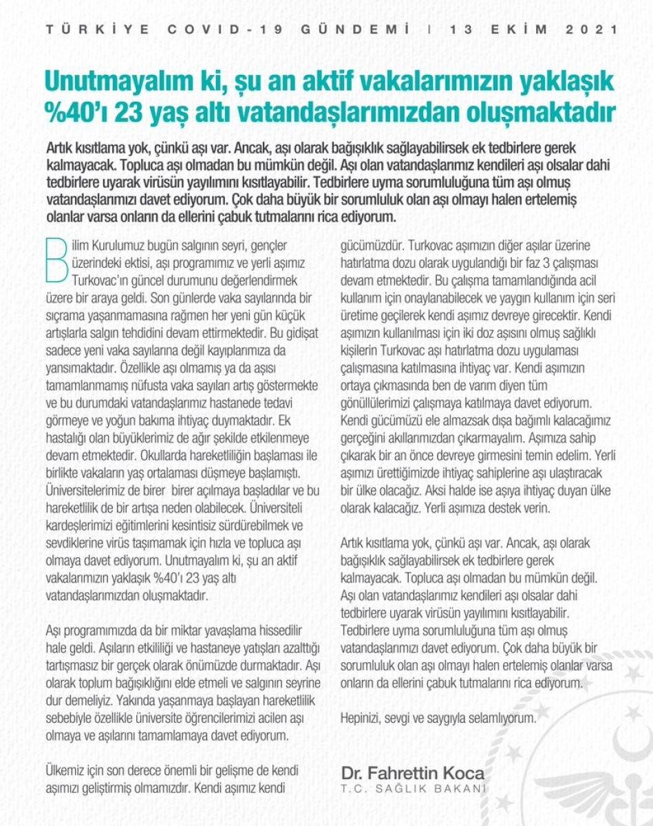 Okullarda hareketliliğin başlaması ile birlikte vakaların yaş ortalaması düşmeye başlamıştı. Üniversitelerimiz de birer birer açılmaya başladılar ve bu hareketlilik de bir artışa neden olabilecek. Üniversiteli kardeşlerimizi eğitimlerini kesintisiz sürdürebilmek ve sevdiklerine virüs taşımamak için hızla ve topluca aşı olmaya davet ediyorum. Unutmayalım ki, şu an aktif vakalarımızın yaklaşık %40’ı 23 yaş altı vatandaşlarımızdan oluşmaktadır.